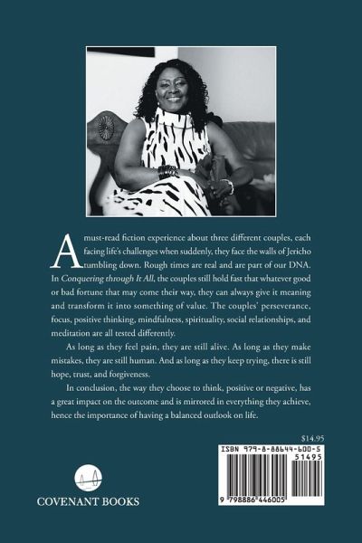 A must-read fiction experience about three different couples, each facing life's challenges when suddenly, they face the walls of Jericho tumbling down. Rough times are real and are part of our DNA. In Conquering through It All, the couples still hold fast that whatever good or bad fortune that may come their way, they can always give it meaning and transform it into something of value. The couples' perseverance, focus, positive thinking, mindfulness, spirituality, social relationships, and meditation are all tested differently. As long as they feel pain, they are still alive. As long as they make mistakes, they are still human. And as long as they keep trying, there is still hope, trust, and forgiveness. In conclusion, the way they choose to think, positive or negative, has a great impact on the outcome and is mirrored in everything they achieve, hence the importance of having a balanced outlook on life.