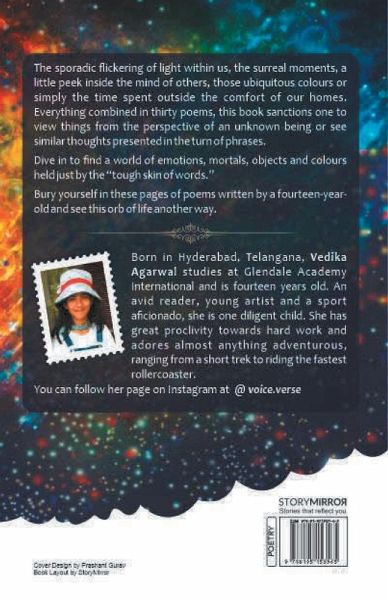 The sporadic flickering of light within us, the surreal moments, a little peek inside the mind of others, those ubiquitous colours or simply the time spent outside the comfort of our homes. Everything combined in thirty poems, this book sanctions one to view things from the perspective of an unknown being or see similar thoughts presented in the turn of phrases. Dive in to find a world of emotions, mortals, objects and colours held just by the "tough skin of words." Bury yourself in these pages of poems written by a fourteen-year-old and see this orb of life another way.