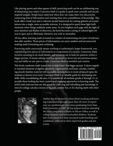 Like playing sports and other games of skill, practicing math can be an exhilarating way of sharpening your mind. Conscious Math is a guide to spark your curiosity and record inspired insights. People learn math best when they can make their own discoveries, connecting dots of information and creating their own constellations of knowledge. This book offers visual cues and a coherent mental framework for uniting galaxies of constellations into a single, more accessible universe. It is designed to spark those light-bulb moments when things suddenly make sense. As you brighten each page with the light of your attention and flashes of discovery, the book becomes a string of colored lights for you to open and re-illuminate whenever you wish to remember. All too often, learning math is treated as a matter of memorizing one piece of information after another. These pieces of information can seem random and unconnected, making math frustrating and confusing. Practicing math consciously means working to understand a larger framework, conceptualizing new pieces of information as components of a system. Conscious Math involves zooming in on small details, and zooming out to look for patterns within a bigger picture. It means asking ourselves questions to focus our unconscious memories and skills on one task at a time. Conscious Math is mindful and creative. This book condenses math instruction to help frame that bigger picture. It draws together essential elements of algebra, geometry, trigonometry, and basic calculus, combining already familiar material with accessible introductions to more advanced topics for students at almost every level. Conscious Math is a valuable guide for developing new skills while consolidating old ones. It is suitable for all students grades 6 through 12, especially those looking for more creative and engaging approaches to learning math. The artful notes and exercises are also good for collecting and rekindling past knowledge in time for college calculus courses or big tests, just for fun, or for sharing math with other people.