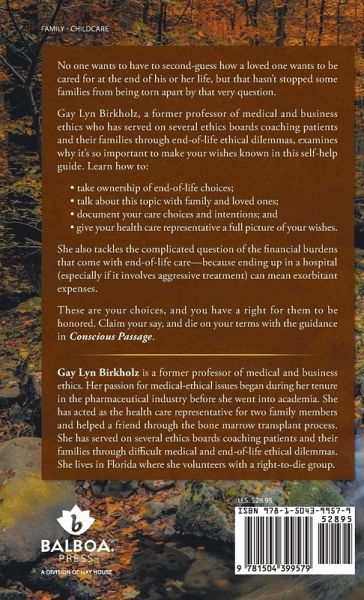 No one wants to have to second-guess how a loved one wants to be cared for at the end of his or her life, but that hasnt stopped some families from being torn apart by that very question. Gay Lyn Birkholz, a former professor of medical and business ethics who has served on several ethics boards coaching patients and their families through end-of-life ethical dilemmas, examines why its so important to make your wishes known in this self-help guide. Learn how to: take ownership of end-of-life choices; talk about this topic with family and loved ones; document your care choices and intentions; and give your health care representative a full picture of your wishes. She also tackles the complicated question of the financial burdens that come with end-of-life carebecause ending up in a hospital (especially if it involves aggressive treatment) can mean exorbitant expenses. These are your choices, and you have a right for them to be honored. Claim your say, and die on your terms with the guidance in Conscious Passage.