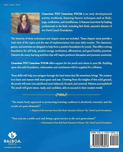 Conscious YOU Conscious YOUth is an early developmental activity workbook, featuring Eastern techniques such as Reiki, yoga, meditation, and mindfulness. It features interviews by leading professionals in the field, including Bob Roth, executive director of the David Lynch Foundation. The histories of these techniques and chapter notes are included. These chapter notes provide a total view of the topics and the ease of implementation into your daily routine. The characters, games, and activities are designed to help form a positive foundation for youth. This offers a strong foundation for self-help, positive energy, meditation, affirmations, and good healthy practices. Discover the many learning activities that will inspire pertinent discussion and promote continuity. Conscious YOU Conscious YOUth offers support for the youth and others in your life. Building upon this solid foundation, information and enrichment will be supplied for a lifetime. These skills will help you navigate through the hard times that life sometimes brings. The mission is to learn and mature with more grace and ease. Drawing from the insights of this solid ground, the youth will enter into adulthood more balanced, focused, and centered. Mission accomplished! The youth will grow aware, ready, and confident, able to succeed in their modern world. "The mind, body approach to promoting learning readiness is absolutely essential, and the results are quite dramatic!" -Experts of the interview from Bob Roth, Executive Director The David Lynch Foundation. "Tori, you are a noble soul and doing a great service to the next generations!" -Endorsement from Bob Roth Executive Director, The David Lynch Foundation