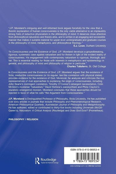 In Consciousness and the Existence of God, J.P. Moreland argues that the existence of finite, irreducible consciousness (or its regular, law-like correlation with physical states) provides evidence for the existence of God. Moreover, he analyzes and criticizes the top representative of rival approaches to explaining the origin of consciousness, including John Searle's contingent correlation, Timothy O'Connor's emergent necessitation, Colin McGinn's mysterian "naturalism," David Skrbina's panpsychism and Philip Clayton's pluralistic emergentist monism. Moreland concludes that these approaches should be rejected in favor of what he calls "the Argument from Consciousness."