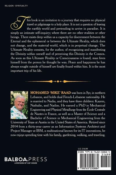 This book is an invitation to a journey that requires no physical travel or pilgrimage to a holy place. It is not a question of leaving the earthly world and pretending to arrive in paradise. It is simply an intimate self-inquiry; where there are no other realities or other beings. There exists deep within us a capacity for discernment between the Eternal and the ephemeral or between the Ultimate Reality, which does not change, and the material world, which is in perpetual change. The Ultimate Reality consists, for the author, of recognizing and manifesting the Divinity within oneself and of perceiving this Divinity in the Cosmos. As soon as this Ultimate Reality or Consciousness is found, man frees himself from the person he thought he was. Peace and happiness he has always sought outside of himself are finally found within him. It is the most important trip of his life.