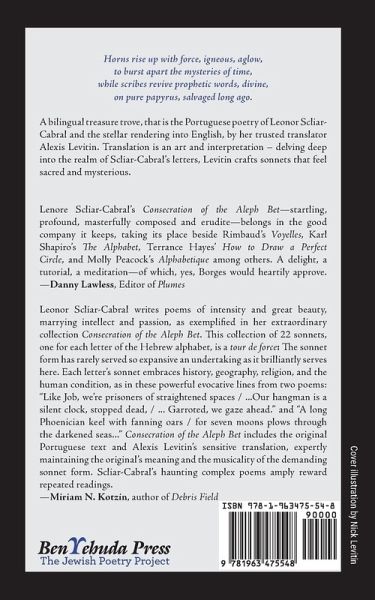 Horns rise up with force, igneous, aglow, to burst apart the mysteries of time, while scribes revive prophetic words, divine, on pure papyrus, salvaged long ago. A bilingual treasure trove, that is the Portuguese poetry of Leonor Scliar-Cabral and the stellar rendering into English, by her trusted translator Alexis Levitin. Translation is an art and interpretation - delving deep into the realm of Scliar-Cabral's letters, Levitin crafts sonnets that feel sacred and mysterious. Lenore Scliar-Cabral's Consecration of the Aleph Bet-startling, profound, masterfully composed and erudite-belongs in the good company it keeps, taking its place beside Rimbaud's Voyelles, Karl Shapiro's The Alphabet, Terrance Hayes' How to Draw a Perfect Circle, and Molly Peacock's Alphabetique among others. A delight, a tutorial, a meditation-of which, yes, Borges would heartily approve. -Danny Lawless, Editor of Plumes Leonor Scliar-Cabral writes poems of intensity and great beauty, marrying intellect and passion, as exemplified in her extraordinary collection Consecration of the Aleph Bet. This collection of 22 sonnets, one for each letter of the Hebrew alphabet, is a tour de force: The sonnet form has rarely served so expansive an undertaking as it brilliantly serves here. Each letter's sonnet embraces history, geography, religion, and the human condition, as in these powerful evocative lines from two poems: "Like Job, we're prisoners of straightened spaces / ...Our hangman is a silent clock, stopped dead, / ... Garroted, we gaze ahead." and "A long Phoenician keel with fanning oars / for seven moons plows through the darkened seas..." Consecration of the Aleph Bet includes the original Portuguese text and Alexis Levitin's sensitive translation, expertly maintaining the original's meaning and the musicality of the demanding sonnet form. Scliar-Cabral's haunting complex poems amply reward repeated readings. -Miriam N. Kotzin, author of Debris Field