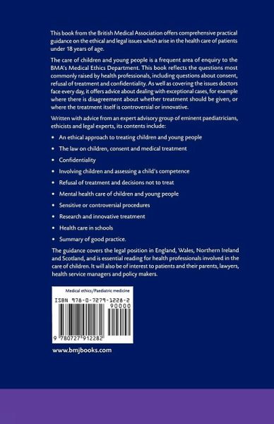This book from the British Medical Association offers comprehensive practical guidance on the ethical and legal issues arise in the health care of patients under 18 years of age. The care of children and young people is a frequent area of enquiry to the BMA's Medical Ethics Department. This book reflects the questions most commonly raised by health professionals, including questions about consent, refusal of treatment and confidentiality. As well as covering the issues doctors face every day, it offers advice about dealing with exceptional cases, for example where there is disagreement about whether treatment should be given, or where the treatment itself is controversial or innovative. Written with advice from an expert advisory group of eminent paediatricians, ethicists and legal experts, its contents include: * An ethical approach to treating children and young people * The law on children, consent and medical treatment * Confidentiality * Involving children and assessing a child's competence * Refusal of treatment and decisions not to treat * Mental health care of children and young people * Sensitive or controversial procedures * Research and innovative treatment * Health care in schools * Summary of good practice The guidance covers the legal position in England, Wales, Northern Ireland and Scotland, and is essential reading for health professionals involved in the care of children. It will also be of interest to patients and their parents, lawyers, health service managers and policy makers.