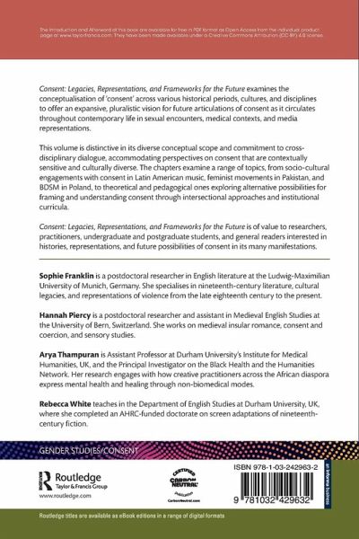 This volume is distinctive in its diverse conceptual scope and commitment to cross-disciplinary dialogue, accommodating perspectives on consent that are contextually sensitive and culturally diverse. The chapters examine a range of topics, from socio-cultural engagements with consent in Latin American music, feminist movements in Pakistan, and BDSM in Poland, to theoretical and pedagogical ones exploring alternative possibilities for framing and understanding consent through intersectional approaches and institutional curricula.