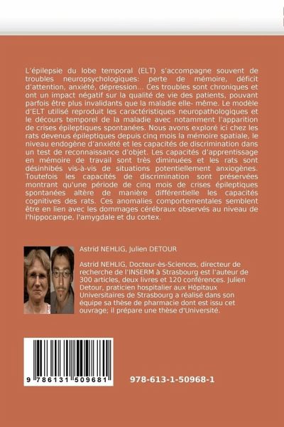 L'épilepsie du lobe temporal (ELT) s'accompagne souvent de troubles neuropsychologiques: perte de mémoire, déficit d'attention, anxiété, dépression... Ces troubles sont chroniques et ont un impact négatif sur la qualité de vie des patients, pouvant parfois être plus invalidants que la maladie elle- même. Le modèle d'ELT utilisé reproduit les caractéristiques neuropathologiques et le décours temporel de la maladie avec notamment l'apparition de crises épileptiques spontanées. Nous avons exploré ici chez les rats devenus épileptiques depuis cinq mois la mémoire spatiale, le niveau endogène d'anxiété et les capacités de discrimination dans un test de reconnaissance d'objet. Les capacités d'apprentissage en mémoire de travail sont très diminuées et les rats sont désinhibés vis-à-vis de situations potentiellement anxiogènes. Toutefois les capacités de discrimination sont préservées montrant qu'une période de cinq mois de crises épileptiques spontanées altère de manière différentielle les capacités cognitives des rats. Ces anomalies comportementales semblent être en lien avec les dommages cérébraux observés au niveau de l'hippocampe, l'amygdale et du cortex.