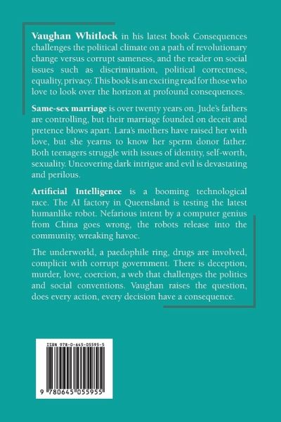 Vaughan Whitlock in his latest book Consequences challenges the political climate on a path of revolutionary change versus corrupt sameness, and the reader on social issues such as discrimination, political correctness, equality, privacy.