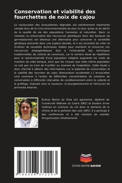 La restauration des écosystèmes dégradés est extrêmement importante compte tenu de la crise environnementale de plus en plus grave et du déclin de la qualité de vie des populations humaines et naturelles. Dans ce contexte, la conservation des ressources génétiques dans des banques de germoplasmes est devenue une alternative pour conserver la variabilité génétique présente dans une espèce donnée, et il est essentiel de créer et d'utiliser de nouvelles techniques viables pour maintenir et conserver ces ressources phytogénétiques face à l'infaisabilité des techniques traditionnelles de collecte de semences, car le nombre élevé de répétitions pour la représentativité d'une population indigène augmente les coûts de maintien de cette banque, ainsi que les risques que cette même population ne soit pas en train de fructifier au moment de l'expédition. Cette étude a donc cherché à obtenir des informations sur le potentiel de conservation et la viabilité des fourches de cajou (Anacardium occidentale L.) lorsqu'elles sont soumises à l'action de différentes concentrations de solutions de conservation à différents intervalles de conditionnement entre la collecte et le greffage, évaluant ainsi la nouaison, le bourgeonnement et l'émission de primordia foliaires.
