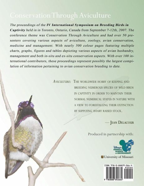 The proceedings of the IV International Symposium on Breeding Birds in Captivity held in in Toronto, Ontario, Canada from September 7-12th, 2007. The conference theme was Conservation Through Aviculture and had over 50 presenters covering various aspects of aviculture, zoology, avian conservation, medicine and management. With nearly 500 colour pages featuring multiple charts, graphs, figures and tables depicting various aspects of avian husbandry, management and both in-situ and ex-situ conservation aspects. With over 100 international contributors, these proceedings represent possibly the largest compilation of information pertaining to avian conservation breeding to date. More information available at www.isbbc.org