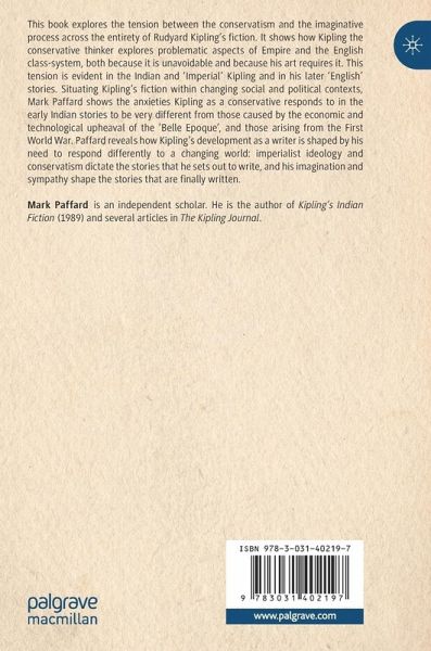 This book explores the tension between the conservatism and the imaginative process across the entirety of Rudyard Kipling's fiction. It shows how Kipling the conservative thinker explores problematic aspects of Empire and the English class-system, both because it is unavoidable and because his art requires it. This tension is evident in the Indian and 'Imperial' Kipling and in his later 'English' stories. Situating Kipling's fiction within changing social and political contexts, Mark Paffard shows the anxieties Kipling as a conservative responds to in the early Indian stories to be very different from those caused by the economic and technological upheaval of the 'Belle Epoque', and those arising from the First World War. Paffard reveals how Kipling's development as a writer is shaped by his need to respond differently to a changing world: imperialist ideology and conservatism dictate the stories that he sets out to write, and his imagination and sympathy shape the stories that are finally written.