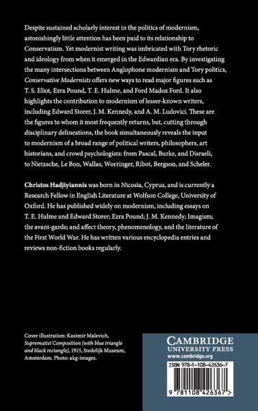 Despite sustained scholarly interest in the politics of modernism, astonishingly little attention has been paid to its relationship to Conservatism. Yet modernist writing was imbricated with Tory rhetoric and ideology from when it emerged in the Edwardian era. By investigating the many intersections between Anglophone modernism and Tory politics, Conservative Modernists offers new ways to read major figures such as T. S. Eliot, Ezra Pound, T. E. Hulme, and Ford Madox Ford. It also highlights the contribution to modernism of lesser-known writers, including Edward Storer, J. M. Kennedy, and A. M. Ludovici. These are the figures to whom it most frequently returns, but, cutting through disciplinary delineations, the book simultaneously reveals the inputs to modernism of a broad range of political writers, philosophers, art historians, and crowd psychologists: from Pascal, Burke, and Disraeli, to Nietzsche, Le Bon, Wallas, Worringer, Ribot, Bergson, and Scheler.