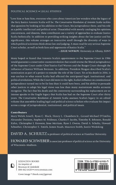 Introduction: Assessing Antonin Scalia's Place in Supreme Court History David Schultz and Howard Schweber Chapter 1: Scalia, Sissies, and Administrative Law David Schultz Chapter 2: Justice Scalia's Modest Employment Discrimination Law Legacy Henry L. Chambers, Jr. Chapter 3: Playing Defense in the "Culture Wars": Justice Scalia on Race, Gender, and Sexual Orientation Mary Welek Atwell Chapter 4: Justice Scalia and Criminal Justice: A Mixed Record with Conservative Impact Christopher E. Smith and Charles F. Jacobs Chapter 5: Threat and Suspicion: Scalia's Legacy for A Transnational Judicial Dialogue Maureen Stobb Chapter 6: The Anti-Madison: Antonin Scalia's Theory of Politics Howard Schweber Chapter 7: Justice Scalia and the Legal Conservative Movement: An Exploration of Nino's Neoconservatism Jesse Merriam Chapter 8: Justice Scalia and the Originalist Fallacy Stephen M. Feldman Chapter 9: The Jurisprudence of Justice Scalia: Common-Law Judging Behind an Originalist Façade Ronald Kahn and Gerard Michael D'Emilio Chapter 10: Justice Scalia and Oral Arguments at the Supreme Court Tim Johnson, Ryan Black, and Ryan Owens Chapter 11: Justice Scalia's Concurring Opinion Writing Ryan J. Owens and Christopher J. Krewson Chapter 12: Justice Scalia's Confirmation Hearing Legacy Alexander Denison and Justin Wedeking Chapter 13: Was Antonin Scalia a "Great" Supreme Court Justice? James Staab About the Editors and Contributors