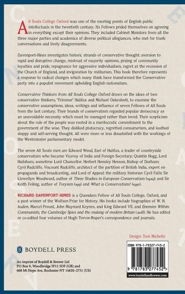 Investigates historic strands of conservative thought and responds to the radical changes which many think have transformed the Conservative party into a populist movement upholding English nationalism. All Souls College Oxford was one of the meeting points of English public intellectuals in the twentieth century. Its Fellows prided themselves on agreeing in everything except their opinions. They included Cabinet Ministers from all the three major parties, and academics of diverse political allegiances, who met for frank conversations and lively disagreements. Davenport-Hines investigates historic strands of conservative thought: aversion to rapid and disruptive change, mistrust of majority opinions, prizing of community loyalties and pride over the assertion of aggressive individualism, the recession of the Church of England, and the impact of militarism. Conservative Thinkers from All Souls College Oxford draws on the ideas of two conservative thinkers, 'Trimmer' Halifax and Michael Oakeshott, to examine the conservative assumptions, ideas, writings and influence of seven Fellows of All Souls from the last century. Their brands of conservatism regarded popular democracy as an unavoidable necessity which must be managed rather than loved. Their scepticism about the rule of the people was rooted in a meritocratic commitment to the government of the wise. They disliked plutocracy, regretted consumerism, and loathed sloppy and self-serving thought. All were more or less dissatisfied with the workings of the Westminster parliamentary model.