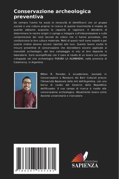 Da sempre l'uomo ha avuto la necessità di identificarsi con un gruppo sociale e una cultura propria; la ricerca di questo inserimento è iniziata da quando abbiamo acquisito la capacità di ragionare. Il desiderio di determinare le nostre origini ci spinge a indagare sull'interpretazione e sulla comprensione dei resti lasciati da coloro che ci hanno preceduto, che costituiscono la loro cultura materiale. Molti di questi resti sono sepolti e per questo motivo devono essere riportati alla luce. Questo lavoro studia le misure preventive di conservazione che dovrebbero essere applicate ai manufatti archeologici, dal loro salvataggio in situ al loro deposito in laboratorio. Sarà esemplificato con il caso di studio di un lavoro sul campo sviluppato nel sito archeologico PUKARA LA ALUMBRERA, nella provincia di Catamarca, in Argentina.