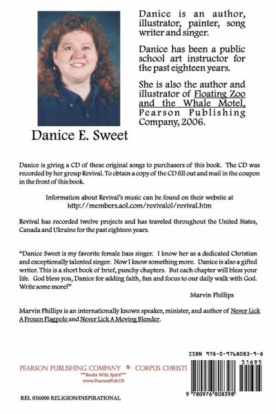 This collection of inspirational vignettes are each related to a song also written by the author and performed and recorded by her musical group, Revival. Each story is guaranteed to lift your spirits and brighten your day. The author is an illustrator, painter, song writer, singer, and she has been a public school art instructor for the past eighteen years. Danice is giving a CD of these original songs to purchasers of this book. The CD was recorded by her group Revival. To obtain a copy of the CD, readers should fill out and mail in the coupon in the front of the book. Revival has recorded twelve projects and has traveled throughout the United States, Canada and Ukraine for the past eighteen years. Ms. Sweet is also the author and illustrator of a book of children's songs, "Floating Zoo and the Whale Motel" previously published by Pearson Publishing Company. Review: "Danice Sweet is my favorite female bass singer. I know her as a dedicated Christian and exceptionally talented singer. Now I know something more. Danice is also a gifted writer. This is a short book of brief, punchy chapters. But each chapter will bless your life. God bless you, Danice for adding faith, fun and focus to our daily walk with God. Write some more!" Marvin Phillips. Marvin Phillips is an internationally known speaker, minister, and author of "Never Lick A Frozen Flagpole" and "Never Lick A Moving Blender."