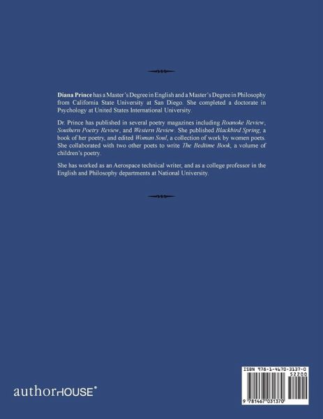 Diana Prince has a Master's Degree in English and a Master's Degree in Philosophy from California State University at San Diego. She completed a doctorate in Psychology at United States International University. Ms. Prince has published in several poetry magazines including Roanoke Review, Southern Poetry Review, and Western Review. She published Blackbird Spring, a book of her poetry, and edited Woman Soul, a collection of work by women poets. She collaborated with two other poets to write The Bedtime Book, a book of children's poetry. She has worked as an Aerospace technical writer, and as a…mehr