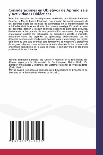 Este libro recopila dos investigaciones realizadas por Nahum Samperio Sánchez y Mayús Loaiza Espinosa, que abordan las consideraciones de los docentes sobre los objetivos de aprendizaje en la implementación de actividades didácticas en el aula. La primera investigación analiza cómo los docentes definen y utilizan objetivos específicos para cada actividad, destacando la importancia de una planificación meticulosa. La segunda investigación explora las actividades de aprendizaje directo e indirecto, mostrando cómo los objetivos de aprendizaje seleccionados por los docentes pueden crear condiciones óptimas para el aprendizaje del inglés. Este libro es una guía esencial para formadores de docentes y profesores de lenguas, ofreciendo una visión crucial en la elección de los procesos de enseñanza-aprendizaje en el aula de inglés y contribuyendo al desarrollo profesional de los docentes.