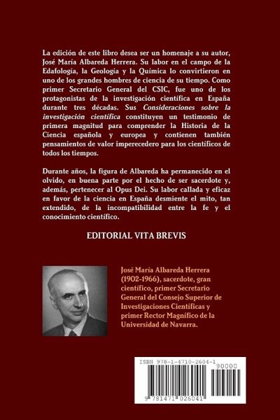 La edición de este libro desea ser un homenaje a su autor, José María Albareda Herrera. Su labor en el campo de la Edafología, la Geología y la Química lo convirtieron en uno de los grandes hombres de ciencia de su tiempo. Como primer Secretario General del CSIC, fue uno de los protagonistas de la investigación científica en España durante tres décadas. Sus Consideraciones sobre la investigación científica constituyen un testimonio de primera magnitud para comprender la Historia de la Ciencia española y europea y contienen también pensamientos de valor imperecedero para los científicos de todos los tiempos. Durante años, la figura de Albareda ha permanecido en el olvido, en buena parte por el hecho de ser sacerdote y, además, pertenecer al Opus Dei. Su labor callada y eficaz en favor de la ciencia en España desmiente el mito, tan extendido, de la incompatibilidad entre la fe y el conocimiento científico.