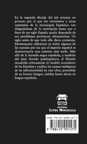 En la segunda década del XIX arranca un proceso por el que los virreinatos y otras capitanías de la monarquía hispánica van desgajándose de la metrópolis hasta que a fines de ese siglo España queda despojada de sus penúltimas provincias ultramarinas. Un siglo antes de que todo ello diera comienzo, Montesquieu reflexiona ya sobre algunas de las razones por las que el imperio español se desmoronaría una centuria más tarde. Más allá de la leyenda negra española, y también del mito dorado panhispánico, el filósofo escudriña críticamente el modelo económico de las Españas y explica las causas endógenas de su infructuosidad en una obra, precedida de su boceto íntegro, inédita hasta ahora en lengua española.
