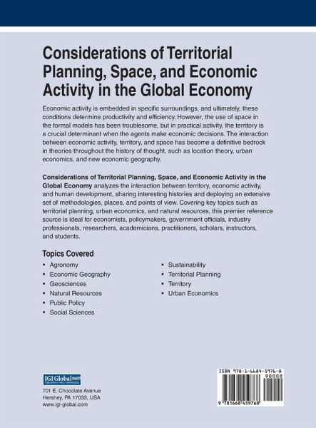 Economic activity is embedded in specific surroundings, and ultimately, these conditions determine productivity and efficiency. However, the use of space in the formal models has been troublesome, but in practical activity, the territory is a crucial determinant when the agents make economic decisions. The interaction between economic activity, territory, and space has become a definitive bedrock in theories throughout the history of thought, such as location theory, urban economics, and new economic geography. Considerations of Territorial Planning, Space, and Economic Activity in the Global Economy analyzes the interaction between territory, economic activity, and human development, sharing interesting histories and deploying an extensive set of methodologies, places, and points of view. Covering key topics such as territorial planning, urban economics, and natural resources, this premier reference source is ideal for economists, policymakers, government officials, industry professionals, researchers, academicians, practitioners, scholars, instructors, and students.