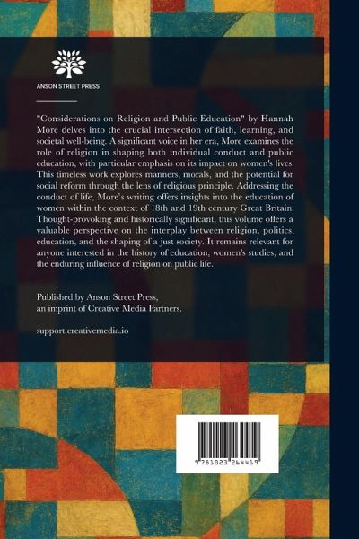"Considerations on Religion and Public Education" by Hannah More delves into the crucial intersection of faith, learning, and societal well-being. A significant voice in her era, More examines the role of religion in shaping both individual conduct and public education, with particular emphasis on its impact on women's lives. This timeless work explores manners, morals, and the potential for social reform through the lens of religious principle. Addressing the conduct of life, More's writing offers insights into the education of women within the context of 18th and 19th century Great Britain. Thought-provoking and historically significant, this volume offers a valuable perspective on the interplay between religion, politics, education, and the shaping of a just society. It remains relevant for anyone interested in the history of education, women's studies, and the enduring influence of religion on public life. This work has been selected by scholars as being culturally important, and is part of the knowledge base of civilization as we know it. This work is in the public domain in the United States of America, and possibly other nations. Within the United States, you may freely copy and distribute this work, as no entity (individual or corporate) has a copyright on the body of the work. Scholars believe, and we concur, that this work is important enough to be preserved, reproduced, and made generally available to the public. We appreciate your support of the preservation process, and thank you for being an important part of keeping this knowledge alive and relevant.