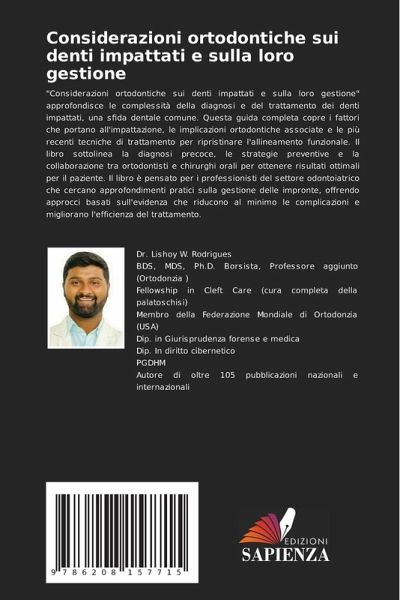 "Considerazioni ortodontiche sui denti impattati e sulla loro gestione" approfondisce le complessità della diagnosi e del trattamento dei denti impattati, una sfida dentale comune. Questa guida completa copre i fattori che portano all'impattazione, le implicazioni ortodontiche associate e le più recenti tecniche di trattamento per ripristinare l'allineamento funzionale. Il libro sottolinea la diagnosi precoce, le strategie preventive e la collaborazione tra ortodontisti e chirurghi orali per ottenere risultati ottimali per il paziente. Il libro è pensato per i professionisti del settore odontoiatrico che cercano approfondimenti pratici sulla gestione delle impronte, offrendo approcci basati sull'evidenza che riducono al minimo le complicazioni e migliorano l'efficienza del trattamento.