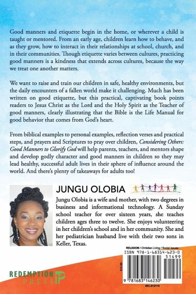 Good manners and etiquette begin in the home, or wherever a child is taught or mentored. From an early age, children learn how to behave, and as they grow, how to interact in their relationships at school, church, and in their communities. Though etiquette varies between cultures, practicing good manners is a kindness that extends across cultures, because the way we treat one another matters. We want to raise and train our children in safe, healthy environments, but the daily encounters of a fallen world make it challenging. Much has been written on good etiquette, but this practical, captivating book points readers to Jesus Christ as the Lord and the Holy Spirit as the Teacher of good manners, clearly illustrating that the Bible is the Life Manual for good behavior that comes from God’s heart. From biblical examples to personal examples, reflection verses and practical steps, and prayers and Scriptures to pray over children, Considering Others: Good Manners to Glorify God will help parents, teachers, and mentors shape and develop godly character and good manners in children so they may lead healthy, successful adult lives in their sphere of influence around the world. And there’s plenty of takeaways for adults too!