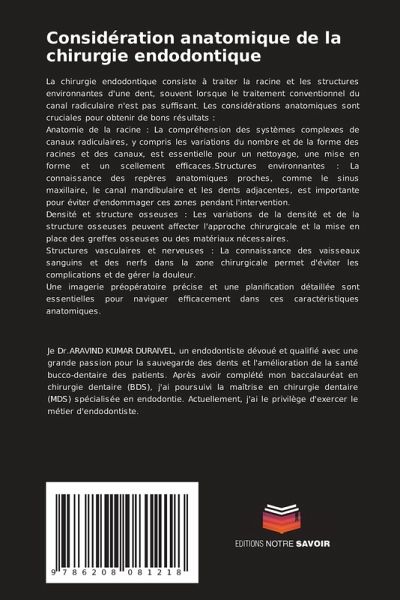 La chirurgie endodontique consiste à traiter la racine et les structures environnantes d'une dent, souvent lorsque le traitement conventionnel du canal radiculaire n'est pas suffisant. Les considérations anatomiques sont cruciales pour obtenir de bons résultats :Anatomie de la racine : La compréhension des systèmes complexes de canaux radiculaires, y compris les variations du nombre et de la forme des racines et des canaux, est essentielle pour un nettoyage, une mise en forme et un scellement efficaces.Structures environnantes : La connaissance des repères anatomiques proches, comme le sinus maxillaire, le canal mandibulaire et les dents adjacentes, est importante pour éviter d'endommager ces zones pendant l'intervention.Densité et structure osseuses : Les variations de la densité et de la structure osseuses peuvent affecter l'approche chirurgicale et la mise en place des greffes osseuses ou des matériaux nécessaires.Structures vasculaires et nerveuses : La connaissance des vaisseaux sanguins et des nerfs dans la zone chirurgicale permet d'éviter les complications et de gérer la douleur.Une imagerie préopératoire précise et une planification détaillée sont essentielles pour naviguer efficacement dans ces caractéristiques anatomiques.