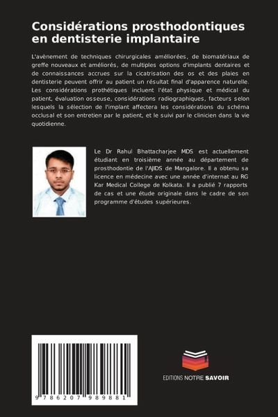 L'avènement de techniques chirurgicales améliorées, de biomatériaux de greffe nouveaux et améliorés, de multiples options d'implants dentaires et de connaissances accrues sur la cicatrisation des os et des plaies en dentisterie peuvent offrir au patient un résultat final d'apparence naturelle. Les considérations prothétiques incluent l'état physique et médical du patient, évaluation osseuse, considérations radiographiques, facteurs selon lesquels la sélection de l'implant affectera les considérations du schéma occlusal et son entretien par le patient, et le suivi par le clinicien dans la vie quotidienne.