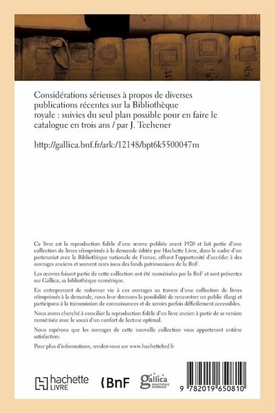 Considérations sérieuses à propos de diverses publications récentes sur la Bibliothèque royale: suivies du seul plan possible pour en faire le catalogue en trois ans / par J. Techener Date de l'édition originale: 1847 Le présent ouvrage s'inscrit dans une politique de conservation patrimoniale des ouvrages de la littérature Française mise en place avec la BNF. HACHETTE LIVRE et la BNF proposent ainsi un catalogue de titres indisponibles, la BNF ayant numérisé ces oeuvres et HACHETTE LIVRE les imprimant à la demande. Certains de ces ouvrages reflètent des courants de pensée caractéristiques de leur époque, mais qui seraient aujourd'hui jugés condamnables. Ils n'en appartiennent pas moins à l'histoire des idées en France et sont susceptibles de présenter un intérêt scientifique ou historique. Le sens de notre démarche éditoriale consiste ainsi à permettre l'accès à ces oeuvres sans pour autant que nous en cautionnions en aucune façon le contenu. Pour plus d'informations, rendez-vous sur www.hachettebnf.fr