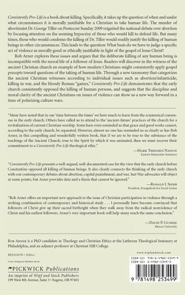 Consistently Pro-Life is a book about killing. Specifically, it takes up the question of when and under what circumstances is it morally justifiable for a Christian to take human life. The murder of abortionist Dr. George Tiller on Pentecost Sunday 2009 reignited the national debate over abortion by focusing attention on the seeming hypocrisy of those who would kill to defend life. But many times, those who would condemn the killing of Dr. Tiller would readily justify the killing of human beings in other circumstances. This leads to the question: What basis do we have to judge a specific act of violence as morally good or ethically justifiable in light of the gospel of Jesus Christ? Rob Arner explores these issues and argues that the deliberate killing of any human being is incompatible with the moral life of a follower of Jesus. Readers will discover in the witness of the ancient Christian church an example of how modern Christians might consistently apply gospel precepts toward questions of the taking of human life. Through a new taxonomy that categorizes the ancient Christian witnesses according to individual issues such as abortion/infanticide, killing in war, and the bloody Roman ""games,"" Consistently Pro-Life demonstrates that the early church consistently opposed the killing of human persons, and suggests that the discipline and moral clarity of the ancient Christians on issues of violence can show us a new way forward in a time of polarizing culture wars.