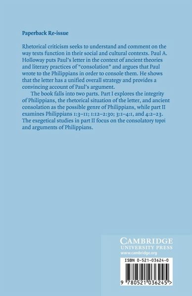 Rhetorical criticism seeks to understand and comment on the way texts function in their social and cultural contexts. Holloway puts Paul's letter in the context of ancient theories and literary practices of 'consolation' and argues that Paul wrote to the Philippians in order to console them. Holloway shows that the letter has a unified overall strategy and provides a convincing account of Paul's argument. The book falls into two parts. Part I explores the integrity of Philippians, the rhetorical situation of the letter, and ancient consolation as the possible genre of Philippians, while Part II examines Phil. 1:3-11; 1:12-2:30; 3:1-4:1 and 4:2-23. The exegetical studies in Part II focus on the consolatory topoi and arguments of Philippians.