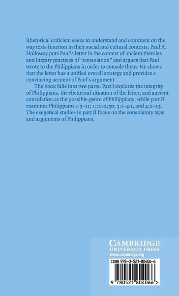 Rhetorical criticism seeks to understand and comment on the way texts function in their social and cultural contexts. Holloway puts Paul's letter in the context of ancient theories and literary practices of 'consolation' and argues that Paul wrote to the Philippians in order to console them. Holloway shows that the letter has a unified overall strategy and provides a convincing account of Paul's argument. The book falls into two parts. Part I explores the integrity of Philippians, the rhetorical situation of the letter, and ancient consolation as the possible genre of Philippians, while Part II examines Phil. 1:3-11; 1:12-2:30; 3:1-4:1 and 4:2-23. The exegetical studies in Part II focus on the consolatory topoi and arguments of Philippians.