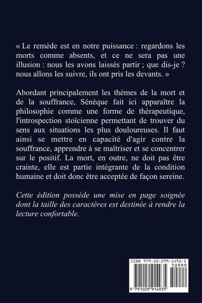 Le remède est en notre puissance : regardons les morts comme absents, et ce ne sera pas une illusion : nous les avons laissés partir ; que dis-je ? nous allons les suivre, ils ont pris les devants. Abordant principalement les thèmes de la mort et de la souffrance, Sénèque fait ici apparaître la philosophie comme une forme de thérapeutique, l'introspection stoïcienne permettant de trouver du sens aux situations les plus douloureuses. Il faut ainsi se mettre en capacité d'agir contre la souffrance, apprendre à se maîtriser et se concentrer sur le positif. La mort, en outre, ne doit pas être crainte, elle est partie intégrante de la condition humaine et doit donc être acceptée de façon sereine. Cette édition possède une mise en page soignée dont la taille des caractères est destinée à rendre la lecture confortable.