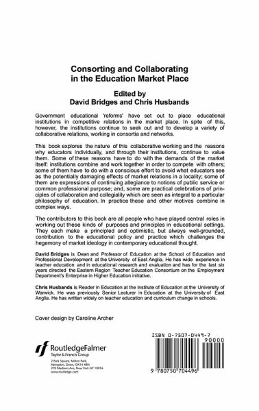 The Education Market-place and the Collaborative Response: An Introduction David Bridges and Chris Husbands. Part 1 Mapping the Development of Collaborative Networks: School, Markets and Collaboration: New Models for Educational Policy? Chris Husbands; Collaboration, Competition and Cross-phase Liaison: the North Lowestoft Schools Network Mike Harbour; The Rationale and Experience of a Schools Association: The St Ives Schools' Association Ron Wallace; Education 2000: Collaboration and Co- operation as a Model of Change Management John Abbott, Nigel Coulthard and Lynne Monck; A Consortium Approach to Staff Development Peter Upton and Phil Cozens; Collaboration and Competition in Education: Marriage not Divorce Sylvia West; Collaboration for School Improvement: The Power of Partnership Michael Johnson and Michael Barber. Part 2 Issues in the Development of Collaborative Networks: Consortium Collaboration: The Experience of TVEI Ann Bridgwood; Consortium Collaboration in Teacher Education: The ERTEC Experience David Bridges; Collaboration Through Networking: The Collaborative Action Research Network Bridget Somekh; Beyond Collaboration: On the Importance of Community Mike Fielding; Theories of Association: The Social Psychology of Working Together in Educational Consortia Harry Gray.