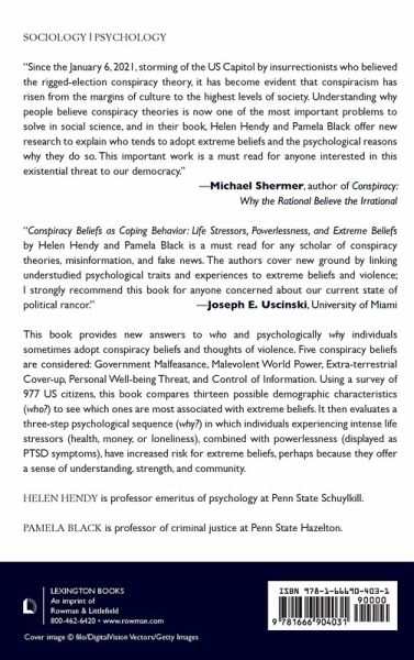 This book provides new answers to who and psychologically why individuals sometimes adopt conspiracy beliefs and thoughts of violence. Five conspiracy beliefs are considered: Government Malfeasance, Malevolent World Power, Extra-terrestrial Cover-up, Personal Well-being Threat, and Control of Information. Using a survey of 977 US citizens, the book compares thirteen possible demographic characteristics (who?) to see which ones are most associated with extreme beliefs. The book then evaluates a three-step psychological sequence (why?) in which individuals experiencing intense life stressors (health, money, or loneliness), combined with powerlessness (displayed as PTSD symptoms), have increased risk for extreme beliefs, perhaps because they offer a sense of understanding, strength, and community.