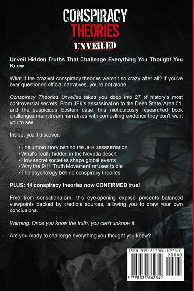 Unveil Hidden Truths of History and Challenge Everything You Thought You Knew What if the craziest conspiracy theories weren't so crazy after all? Are you fascinated by the secrets hidden behind history's most controversial events? Truth-seekers everywhere are asking the same questions. Now, it's time to explore the mysteries together. In CONSPIRACY THEORIES UNVEILED, you'll discover the 27 most controversial and shocking secrets that powerful forces don't want you to know, including:The untold story of JFK's assassination: Evidence that shatters the lone gunman theory Deep State revelations: The hidden hand controlling global politics Area 51's darkest secrets: What's really hidden in the Nevada desert The Epstein mystery: Theories surrounding his suspicious death 9/11 Truth Movement: Evidence that challenges the official narrative Government black ops: Shocking revelations from declassified files PLUS: 14 conspiracy theories that have been CONFIRMED true - the stories they finally had to admit were real! This meticulously researched book offers balanced viewpoints backed by credible sources and historical context. Warning: Once you know the truth, you can't unknow it.