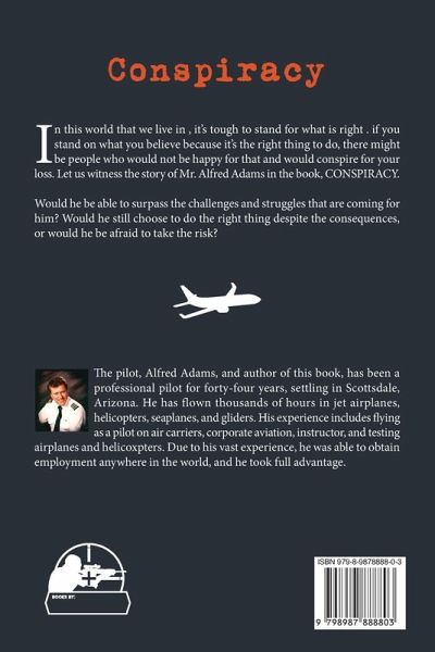 In this world that we live in, it's tough to stand for what is right. if you stand on what you believe because it's the right thing to do, there might be people who would not be happy for that and would conspire for your loss. Let us witness the story of Mr. Alfred Adams in the book, CONSPIRACY. Would he be able to surpass the challenges and struggles that are coming for him? Would he still choose to do the right thing despite the consequences, or would he be afraid to take the risk? The pilot, Alfred Adams, and author of this book, has been a professional pilot for forty-four years, settling in Scottsdale, Arizona. He has flown thousands of hours in jet airplanes, helicopters, seaplanes, and gliders. His experience includes flying as a pilot on air carriers, corporate aviation, instructor, and testing airplanes and helicopters. Due to his vast experience, he was able to obtain employment anywhere in the world, and he took full advantage.
