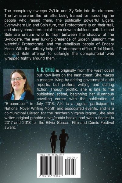 The conspiracy sweeps Zy'Lin and Zy'Soln into its clutches. The twins are on the run after being framed for murdering the people who raised them, the politically powerful Eigers. Everywhere Lin and Soln turn, the Protectorate is on their trail, and shady characters point them down a dubious path. Lin and Soln are unsure who to trust between the shadow of the Syndicate, the ever lurking presence of Gideon Daimont, the watchful Protectorate, and the rebellious people of Encary Moon. With the unlikely help of Protectorate office, Griel Marsil, Lin and Soln attempt to untangle the conspiratorial web wrapped tightly around them.