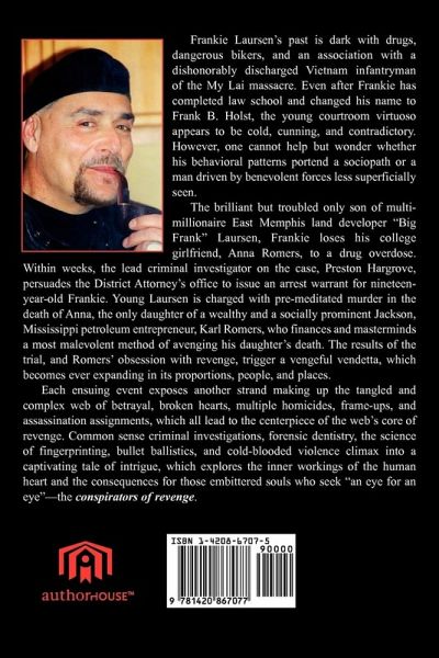 Frankie Laursen's past is dark with drugs, dangerous bikers, and an association with a dishonorably discharged Vietnam infantryman of the My Lai massacre. Even after Frankie has completed law school and changed his name to Frank B. Holst, the young courtroom virtuoso appears to be cold, cunning, and contradictory. However, one cannot help but wonder whether his behavioral patterns portend a sociopath or a man driven by benevolent forces less superficially seen. The brilliant but troubled only son of multimillionaire East Memphis land developer "Big Frank" Laursen, Frankie loses his college girlfriend, Anna Romers, to a drug overdose. Within weeks, the lead criminal investigator on the case, Preston Hargrove, persuades the District Attorney's office to issue an arrest warrant for nineteenyear- old Frankie. Young Laursen is charged with pre-meditated murder in the death of Anna, the only daughter of a wealthy and a socially prominent Jackson, Mississippi petroleum entrepreneur, Karl Romers, who finances and masterminds a most malevolent method of avenging his daughter's death. The results of the trial, and Romers' obsession with revenge, trigger a vengeful vendetta, which becomes ever expanding in its proportions, people, and places. Each ensuing event exposes another strand making up the tangled and complex web of betrayal, broken hearts, multiple homicides, frame-ups, and assassination assignments, which all lead to the centerpiece of the web's core of revenge. Common sense criminal investigations, forensic dentistry, the science of fingerprinting, bullet ballistics, and cold-blooded violence climax into a captivating tale of intrigue, which explores the inner workings of the human heart and the consequences for those embittered souls who seek "an eye for an eye"-the conspirators of revenge.