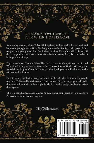 Dragons love longest, even when hope is gone... As a young woman, Moire Tobin fell hopelessly in love with a brave, loyal, and handsome young naval officer. Nothing, not even her family, could persuade her to spurn the young man. But fate had other ideas. Even when Oliver broke off their engagement, her tattered heart refused to stop loving. Every beat carried with it the promise of hope. Eight years later, Captain Oliver Hartford returns to the quiet corner of rural Wyldefen. Having amassed a fortune, he is determined to find a wife. Any one would do, so long as it's not Moire-the quiet, intelligent, and kind woman who still haunts his dreams. Fate, it seems, has had a change of heart and has decided to throw the couple together. This could be their second chance at love. Dragons might prove the salve that eases old wounds, or they might be the irrevocable wedge that forever drives them apart... This is a standalone, second chance fantasy romance inspired by Jane Austen's Persuasion...but with more dragons.