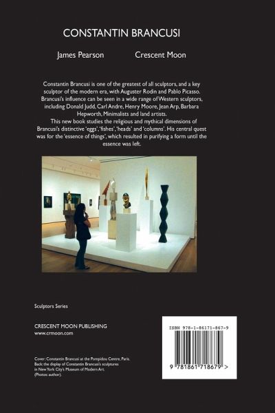 CONSTANTIN BRANCUSI SCULPTING THE ESSENCE OF THINGS By James Pearson Large Print Edition Constantin Brancusi is one of the greatest of all sculptors, and a key sculptor of the modern era, along with Auguste Rodin and Pablo Picasso. Brancusi's influence can be seen in a wide range of Western sculptors, including Donald Judd, Carl Andre, Henry Moore, Jean Arp, Barbara Hepworth, Minimalists and land artists. This new book studies the religious and mythical dimensions of Constantin Brancusi's distinctive scultpural forms, the 'eggs', 'fishes', 'heads' and 'columns'. His central quest was for the 'essence of things', which resulted in purifying a form until only the essence was left. It was Constantin Brancusi's project to strip away the detritus that had accumulated around sculpture, Henry Moore said, and to offer the pure, simple shape. What Brancusi did was 'to concentrate on very simple shapes, to keep his sculpture, as it were, one-cylindered, to refine and polish a single shape to a degree almost too precious.' As well as being a sculptor, Constantin Brancusi was also an accomplished photographer. Quite a few artists (not all of them sculptors) have expressed for Brancusi's photographs, and the way he would set up his sculptures in his studio and photograph them at particular times of the day, when the lighting was just right. They are early examples of installation art (and some of the best, too). Andy Goldsworthy said he admired how Brancusi created the right conditions in his studio so that his work 'comes alive at a particular time of the day as the light momentarily touches it'. For Goldsworthy, Brancusi's works were at their best when they were arranged by the sculptor in his studio and photographed. Somehow, it wasn't quite the same when they were displayed in modern art museums (such as the Pompidou Centre in Paris or the Museum of Modern Art in Gotham, which have important Brancusi pieces). Fully illustrated, including many photos of Constantin Brancusi's studio in Paris, Brancusi's works in museums in New York, Washington and L.A., forerunners and influences, prehistoric art, and the art of his contemporaries. With bibliography and notes. 248 pages. With a full colour cover. This new (5th) edition has been revised. Large Print Edition - in 18-point type. www.crmoon.com