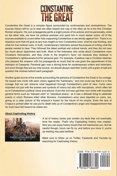 If you want to discover the captivating life of Constantine the Great, then keep reading... Constantine the Great is a complex figure surrounded by controversies and contradictions. The sources history left for us to read are often biased one way or the other as he is the first Christian Roman emperor. His own propaganda paints a bright picture of his actions and his personality, while on the other side, we have his political enemies who paint him in much darker colors. All of the sources available to us are either fully supporting Constantine or are strictly against him. There is no objective work that will give us any true insight on how Constantine lived, what he was thinking, and what his true motives were. In truth, contemporary historians served the purpose of writing what the people wanted to hear. They followed the latest political and cultural trends, and they did not care too much about objectivism and truth. The questions like what sort of a man was Constantine and what exactly did he achieve during his reign are still baffling historians. It is through tracking the right material and reading in between the lines that we are able to give some sort of answer. We have to use our common sense to discern the truth in the pages of propaganda and paint a new, more accurate picture of Constantine the Great, his deeds, and his persona. In Constantine the Great: A Captivating Guide to the First Christian Roman Emperor and How He Ruled the Roman Empire, you will discover topics such as The Early Life of Constantine the Great Early Rule Civil Wars Constantine, the Lavish Administrator The Man behind the Emperor Constantinople Constantine and Christianity Late Rule and Death And much, much more! So if you want to learn more about Constantine the Great, scroll up and click the "add to cart" button!