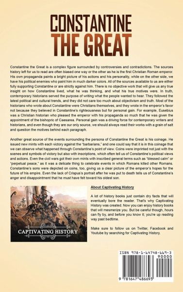 If you want to discover the captivating life of Constantine the Great, then keep reading... Constantine the Great is a complex figure surrounded by controversies and contradictions. The sources history left for us to read are often biased one way or the other as he is the first Christian Roman emperor. His own propaganda paints a bright picture of his actions and his personality, while on the other side, we have his political enemies who paint him in much darker colors. All of the sources available to us are either fully supporting Constantine or are strictly against him. There is no objective work that will give us any true insight on how Constantine lived, what he was thinking, and what his true motives were. In truth, contemporary historians served the purpose of writing what the people wanted to hear. They followed the latest political and cultural trends, and they did not care too much about objectivism and truth. The questions like what sort of a man was Constantine and what exactly did he achieve during his reign are still baffling historians. It is through tracking the right material and reading in between the lines that we are able to give some sort of answer. We have to use our common sense to discern the truth in the pages of propaganda and paint a new, more accurate picture of Constantine the Great, his deeds, and his persona. In Constantine the Great: A Captivating Guide to the First Christian Roman Emperor and How He Ruled the Roman Empire, you will discover topics such as The Early Life of Constantine the Great Early Rule Civil Wars Constantine, the Lavish Administrator The Man behind the Emperor Constantinople Constantine and Christianity Late Rule and Death And much, much more! So if you want to learn more about Constantine the Great, scroll up and click the "add to cart" button!
