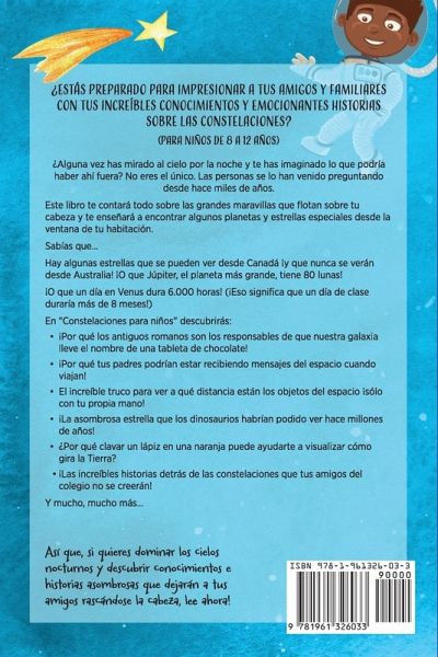 ¿Estás preparado para impresionar a tus amigos y familiares con tus increíbles conocimientos y emocionantes historias sobre las constelaciones? Si es así, continúa escuchando... ¿Alguna vez has mirado al cielo por la noche y te has imaginado lo que podría haber ahí fuera? No eres el único. Las personas se lo han venido preguntando desde hace miles de años. La tecnología, como los telescopios y los transbordadores espaciales, es bastante reciente, así que antes de que pudiéramos investigar el espacio, la gente se inventaba historias sobre lo que creía que había ahí arriba. Algunos veían héroes y monstruos formados por estrellas y contaban historias sobre ellos. Este libro te contará todo sobre las grandes maravillas que flotan sobre tu cabeza y te enseñará a encontrar algunos planetas y estrellas especiales desde la ventana de tu habitación. También encontrarás numerosas historias legendarias sobre las constelaciones, como la constelación de Hércules, que lo muestra luchando contra el monstruo Hidra, o la de Pegaso, un mágico caballo alado volador, que era el único animal que podía transportar los rayos de Zeus sin hacerse daño. Descubrir las constelaciones no tiene por qué ser difícil, aunque no tengas un telescopio. ¡Incluso puedes encontrarlas utilizando tus manos! Prueba este MANUAL (juego de palabras totalmente intencionado) repleto de trucos para ayudarte a encontrar las estrellas:Estira el brazo hacia delante y cierra la mano en un puño. La distancia entre el primer nudillo (sin contar el pulgar) y el cuarto, es de 10 grados. Ahora extiende sólo el pulgar y el meñique. La distancia de punta a punta es de 25 grados (si levantas sólo el dedo meñique, su ancho será de 1 grado). ¡Esto te ayudará a navegar por el cielo nocturno para encontrar las constelaciones indicadas en este libro! Sabías que... Hay algunas estrellas que se pueden ver desde Canadá ¡y que nunca se verán desde Australia! ¡O que Júpiter, el planeta más grande, tiene 80 lunas! ¡O que un día en Venus dura 6.000 horas! (¡Eso significa que un día de clase duraría más de 8 meses!) En "Constelaciones para niños" descubrirás:¡Por qué los antiguos romanos son los responsables de que nuestra galaxia lleve el nombre de una tableta de chocolate! ¡Por qué tus padres podrían estar recibiendo mensajes del espacio cuando viajan! El increíble truco para ver a qué distancia están los objetos del espacio ¡sólo con tu propia mano! ¡Las increíbles historias detrás de las constelaciones que tus amigos del colegio no se creerán! El planeta en el que no viven extraterrestres, ¡sino robots! Hacia dónde apuntaban las pirámides de los antiguos egipcios. Por qué deberías preparar tu cámara para el año 2061. ¡Por qué la gravedad de la Luna puede ser la mejor amiga de los surfistas! Qué fruta iluminar con una linterna para visualizar las fases lunares. Y mucho más! Desde el gigante Virgo hasta la mucho más pequeña Corona Boreal, descubrirás todos los trucos y consejos para encontrar las constelaciones, así como algunos datos asombrosos que te harán parecer un astrónomo profesional. Hay tantas cosas por explorar en el espacio que ni siquiera los científicos saben exactamente lo que hay ahí fuera. ¿Quién sabe lo que ellos (¡o tú!) descubrirán en el futuro? Así que, si quieres dominar los cielos nocturnos y descubrir conocimientos e historias asombrosas que dejarán a tus amigos rascándose la cabeza, pasar la primera página...