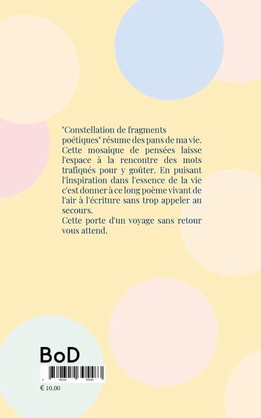 Constellation de fragments poétiques résume des pans de ma vie. Cette mosaique de pensées laisse l'espace à la rencontre des mots trafiqués pour y goûter. En puisant l'inspiration dans l'essence de la vie c'est donner à ce long poème vivant de l'air à l'écriture sans trop appeler au secours. Cette porte d'un voyage sans retour vous attend.