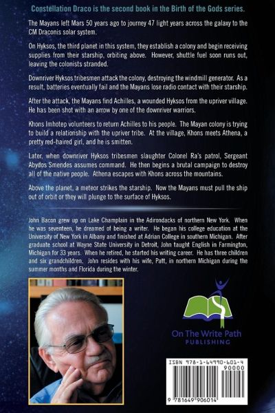 Constellation Draco is the second book in the Birth of the Gods series. The Mayans left Mars 50 years ago to journey 47 light years across the galaxy to the CM Draconis solar system. On Hyksos, the third planet in this system, they establish a colony and begin receiving supplies from their starship, orbiting above. However, shuttle fuel soon runs out, leaving the colonists stranded. Downriver Hyksos tribesmen attack the colony, destroying the windmill generator. As a result, batteries eventually fail and the Mayans lose radio contact with their starship. After the attack, the Mayans find Achilles, a wounded Hyksos from the upriver village. He has been shot with an arrow by one of the downriver warriors. Khons Imhotep volunteers to return Achilles to his people. The Mayan colony is trying to build a relationship with the upriver tribe. At the village, Khons meets Athena, a pretty red-haired girl, and he is smitten. Later, when downriver Hyksos tribesmen slaughter Colonel Ra's patrol, Sergeant Abydos Smendes assumes command. He then begins a brutal campaign to destroy all of the native people. Athena escapes with Khons across the mountains. Above the planet, a meteor strikes the starship. Now the Mayans must pull the ship out of orbit or they will plunge to the surface of Hyksos.