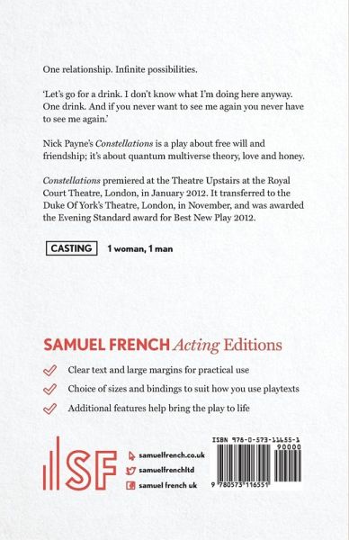 One relationship. Infinite possibilities. 'Let's go for a drink. I don't know what I'm doing here anyway. One drink. And if you never want to see me again you never have to see me again.' Nick Payne's Constellations is a play about free will and friendship; it's about quantum multiverse theory, love and honey. Constellations premiered at the Theatre Upstairs at the Royal Court Theatre, London, in January 2012. It transferred to the Duke Of York's Theatre, London, in November, and was awarded the Evening Standard award for Best New Play 2012.