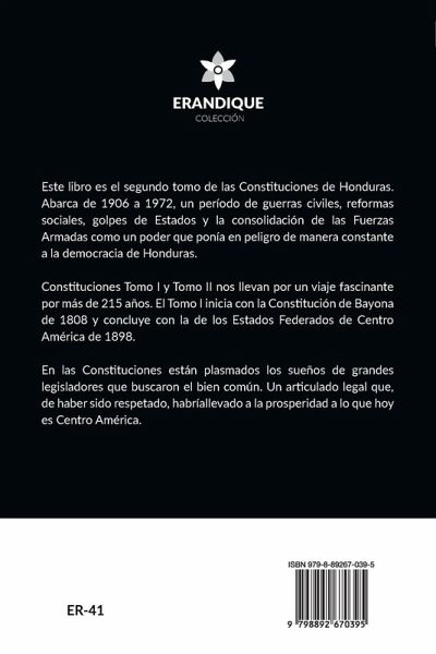Este libro es el segundo tomo de las Constituciones de Honduras. Abarca de 1906 a 1972, un período de guerras civiles, reformas sociales, golpes de Estados y la consolidación de las Fuerzas Armadas como un poder que ponía en peligro de manera constante a la democracia de Honduras. Constituciones Tomo I y Tomo II nos llevan por un viaje fascinante por más de 215 años. El Tomo I inicia con la Constitución de Bayona de 1808 y concluye con la de los Estados Federados de Centro América de 1898. En las Constituciones están plasmados los sueños de grandes legisladores que buscaron el bien común. Un articulado legal que, de haber sido respetado, habría llevado a la prosperidad a lo que hoy es Centro América.